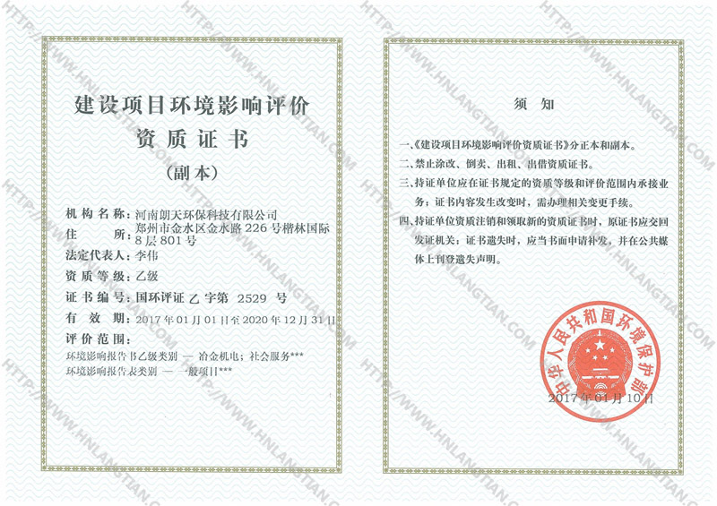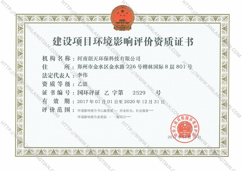 河南朗天環(huán)保科技有限公司,原為河南農(nóng)大風(fēng)景園林規(guī)劃設(shè)計(jì)院環(huán)境研究所,于2005年6月30日正式取得由國家環(huán)境保護(hù)部頒發(fā)的環(huán)境影響評(píng)價(jià)乙級(jí)資質(zhì)證書(國環(huán)評(píng)乙字第2529號(hào)),注冊(cè)地址鄭州市金水區(qū)金水路226號(hào)楷林國際8層801號(hào),注冊(cè)資金500萬元。主要從事環(huán)境影響評(píng)價(jià)、環(huán)保技術(shù)咨詢、土壤環(huán)境調(diào)查、第三方環(huán)境監(jiān)查及督導(dǎo)、竣工環(huán)境保護(hù)驗(yàn)收、突發(fā)環(huán)境事件應(yīng)急預(yù)案、區(qū)域環(huán)境現(xiàn)狀評(píng)估、排污許可申報(bào)、清潔生產(chǎn)審核、環(huán)境工程治理、空氣質(zhì)量精細(xì)化管控(專家組)等。公司在“以質(zhì)量求生存、以信譽(yù)求發(fā)展”經(jīng)營理念的指導(dǎo)下,秉承改善人類環(huán)境、實(shí)現(xiàn)最佳經(jīng)濟(jì)效益與環(huán)境效益之宗旨,倡導(dǎo)科技創(chuàng)新之精神,依托雄厚的技術(shù)力量,致力于環(huán)境影響評(píng)價(jià)工作及環(huán)境工程技術(shù)咨詢的科研工作。